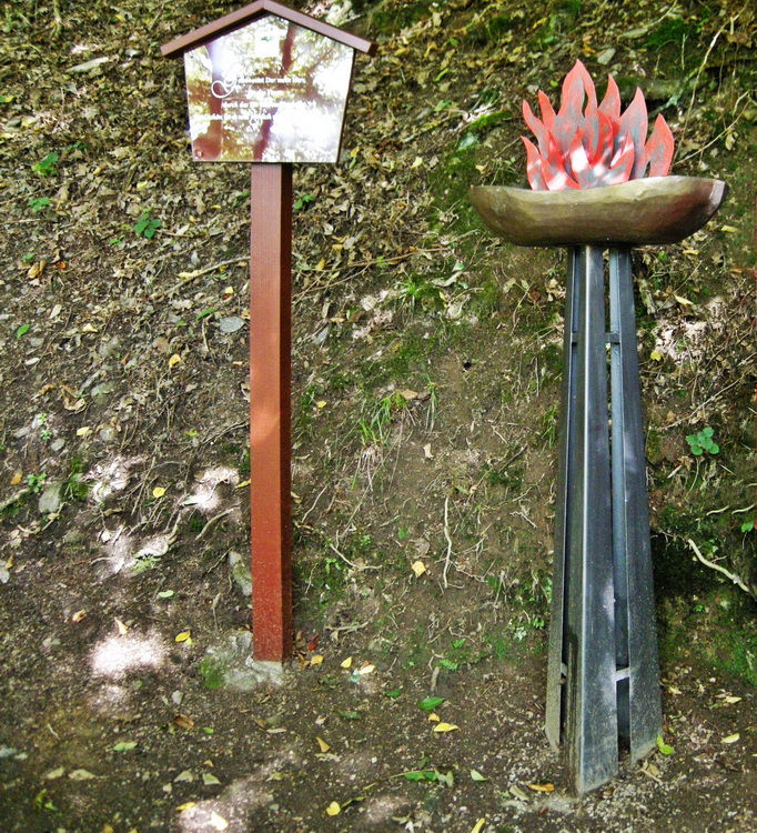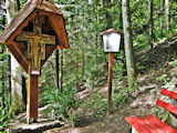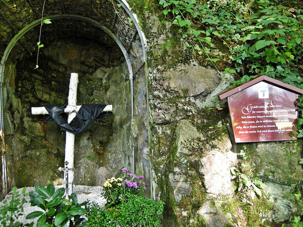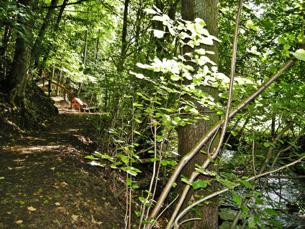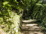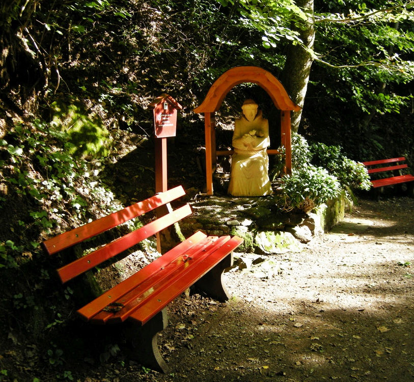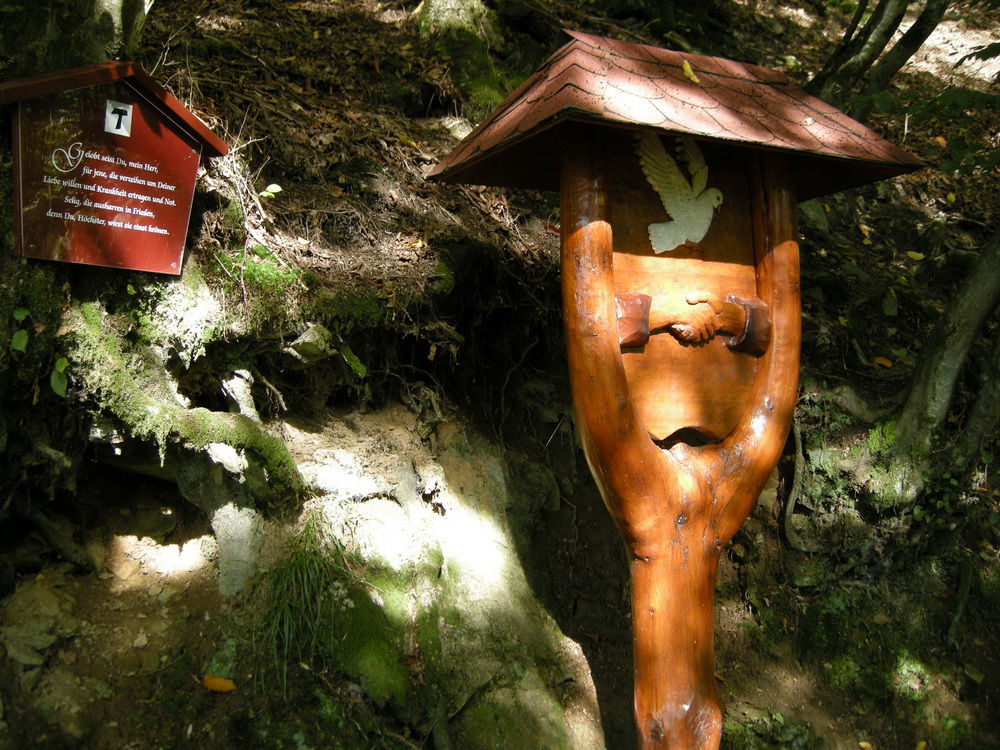 Angenehmer, beschatteter Bergpfad mit schönen und besinnlichen Stationen.