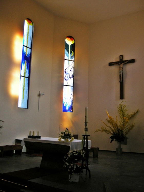 Die markanten Fenster im Chorraum ziehen die Blicke auf sich. Die Motive des Sonnengesangs! Links ergießt sich aus der aufgehenden Sonne ein gleißend heller Lichtstrom von oben herab über die großgefassten Glasfenster. Aus dem Dunkel der Nacht spiegelt der Mond, hervorgehoben aus dem Reigen der Sterne, den verborgenen Glanz der Sonne auf die Erde. Wind, Wolken und Regen durchströmt dieser Lichtstrom des Lebens.