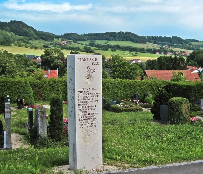 Vom Friedhof aus kann man beinahe den gesamten Verlauf des Franziskusweges einsehen. Am Hauptweg durch den alten Teil des Friedhofes befindet sich in einem Durchgang die Stationstafel. Wenige Meter weiter steht eine Stele aus Marmor. Auf ihr wurde der Vers über den Bruder Tod eingemeißelt. Darüber eine dem Auge nachempfundene, runde Vertiefung, in deren Zentrum ein kleines Loch durch den Marmorblock gebohrt ist. Das Loch in der Stele symbolisiert den Durchgang von diesem Leben in eine andere Daseinsform. Oder im christlichen Sinne die Auferstehung, den Sieg des Lebens über den Tod.