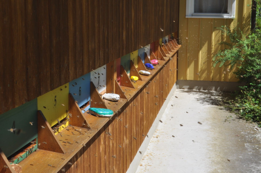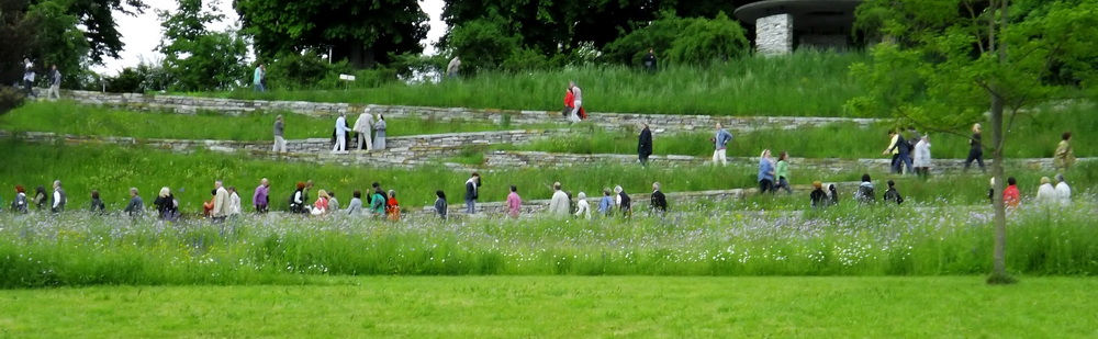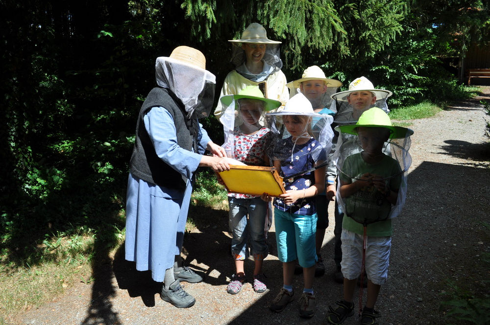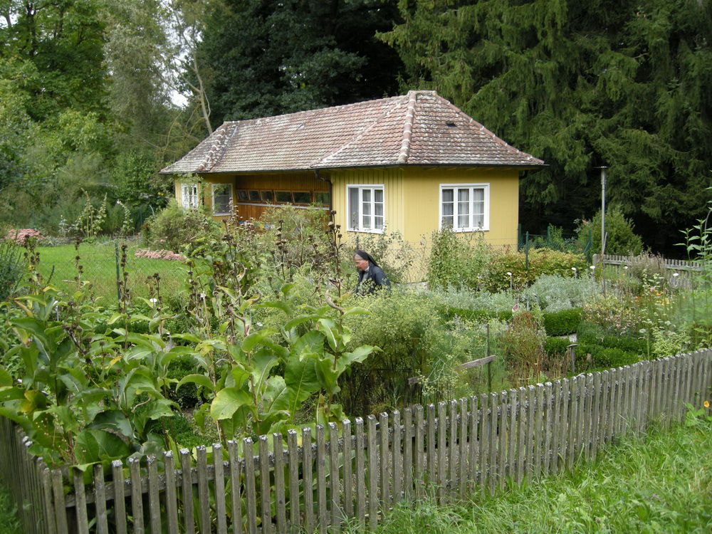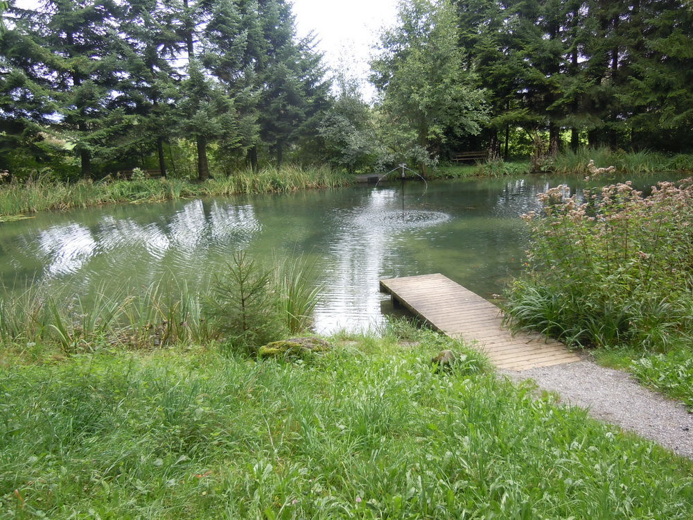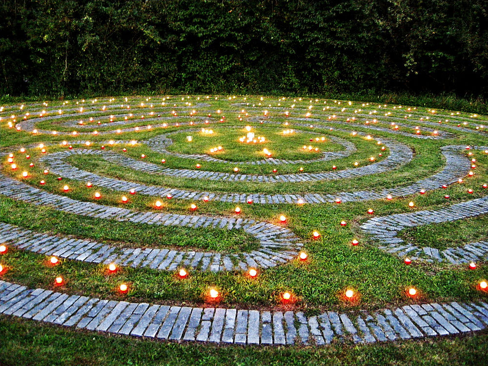 Die verschiedenen Gestaltungselemente des Gartens laden zur Entdeckungsreise ein: Menschensonnenuhr, Wasserquelle, Labyrinth, Kräutergarten, Bienenhaus, Feuerstelle, Weiher, Wald und eine kleine Kapelle.